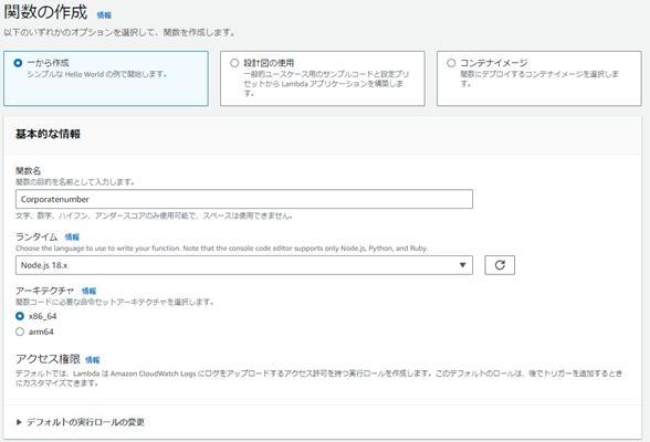 ② 任意の関数名を入力し、ランタイムはNode.js 18.xに設定します。