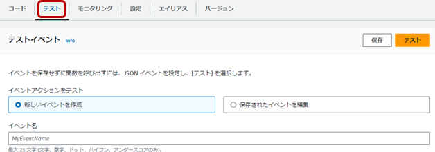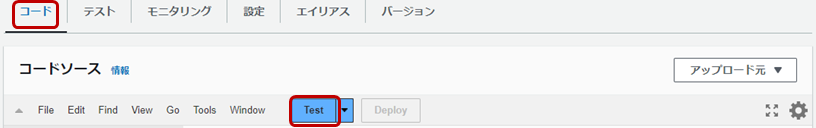 ⑦ コードタブに戻り先ほど作成したテストイベントを指定しTestを行います。